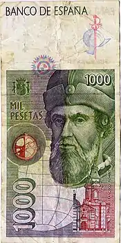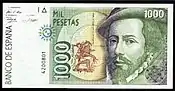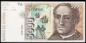 | En 1992, la Banque d'Espagne a publié sa dernière série avant l'introduction de l'Euro. Les billets ont été faits par l'artiste graphique Reinhold Gerstetter et imprimé par la "Fábrica Nacional de Moneda y Timbre". L'objectif de la Banque d'Espagne, la question de cette nouvelle série était de renforcer la sécurité à travers des micro-texte imprimé et indices visible uniquement avec une loupe. Cette série de billets combine des éléments artistiques espagnols et américains pour célébrer en le 500e anniversaire de la découverte de l'Amérique par Christophe Colomb. | ||||||||||||