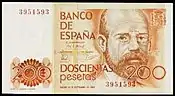 | Entre 1982 et 1987 la Banque d'Espagne émet une nouvelle série de billets, dessinés par José María Cruz Novillo, qui fut gravée et imprimée par la "Fábrica Nacional de Moneda y Timbre". Les objectifs de la Banque d'Espagne était de réduire la taille des billets, de les normaliser, faciliter leur traitement mécaniquement et moderniser son image. Les nouveaux billets suivent la règle des 1-2-5. Les billets de 200 et 2000 pesetas sont introduits pour la première fois. | ||||||||||||
