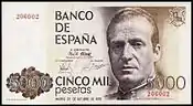 5000 Ptas | 156 × 85 mm | Marron | Juan Carlos Ier d'Espagne | Palais royal de Madrid et texte manuscrit extrait du discours du de Juan Carlos Ier : "Para la Corona y para los demás órganos del estado, todas las aspiraciones son legítimas, y todas deben, en beneficio de la comunidad, limitarse recíprocamente" |