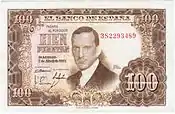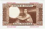 100 Ptas | 127 x 78 mm | Marron | Julio Romero de Torres | La Fuensanta, tableau de Julio Romero de Torres | P-145 | |||||