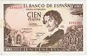 100 Ptas | 127 x 76 mm | Marron | Francisco Bayeu | El Cacharrero de Francisco de Goya | Tête de Francisco de Goya | P-137 | ||||