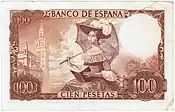 100 Ptas | 129 × 78 mm | Marron | Gustavo Adolfo Bécquer | Mise en scène d'un vers du poète: une dame romantique devant la cathédrale de Séville. | Tête d'une femme | P-150 | ||||