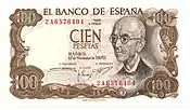 100 Ptas | 123 × 66 mm | Marron | Manuel de Falla | L'Alhambra de Grenade | Manuel de Falla | P-152 | ||||