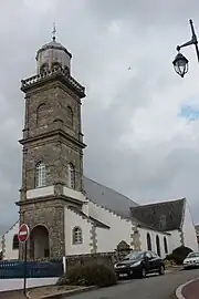 - L'église Saint-Maxent remonte au XVIe siècle pour la partie la plus ancienne, le chœur notamment. Elle a été profondément remaniée au XIXe siècle et rénovée en 1995. L’église du XVIIe siècle ne comportait qu’une nef sans bas-côtés et un petit clocher. Vers 1830, deux événements vont se conjuguer pour entraîner la décision de l’agrandir très sensiblement : Ainsi en 1837, le recteur Guyot constate que l’église ne répond plus aux besoins de la paroisse : elle est délabrée, exiguë, obscure, des marins étrangers affluent ; il faut laisser les portes ouvertes pendant les offices car beaucoup de fidèles doivent rester dehors ; Surtout cette même année, la grande église abbatiale de Prières, située à la sortie du bourg vers l’Océan, est démolie et les matériaux sont mis aux enchères par Monsieur Le Masne, le nouveau propriétaire de l’ancienne abbaye, fermée au culte à la Révolution[28]. Le recteur Guyot saisit cette occasion exceptionnelle pour obtenir des matériaux à peu de frais. C’est ainsi que de grands travaux furent entrepris : deux bas-côtés furent construits avec quatre piliers de chaque côté : base en granit, partie haute en tuffeau ou pierre blanche, très utilisée dans l’abbatiale de Prières, et quatre travées transversales avec huit voûtes, une porte de part et d’autre et 4 fenêtres de plein cintre ; un porche fut ajouté ; une tour carrée de 15 mètres de hauteur, surmontée d’une lanterne de phare de 6 mètres, remplaça le petit clocher. Elle servait d'amer.