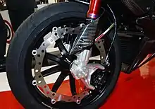 Le freinage est assuré par Brembo, avec deux disques de 320 mm de diamètre à l'avant, mordus par des étriers radiaux quatre pistons, et un simple disque de 220 mm de diamètre à l'arrière, pincé par un étrier double piston[3].