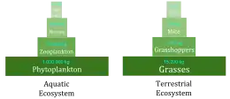 En milieu aérien, la biomasse des producteurs primaires est souvent très supérieure à la biomasse des consommateurs, tout particulièrement dans les forêts où une grande partie de la biomasse est constituée de bois. Dans les milieux aquatiques et tout particulièrement océaniques, la biomasse des producteurs primaires (phytoplancton) est en général plus faible que celle des consommateurs, mais cette biomasse se renouvelle rapidement[22].
