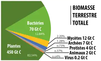 - Contrairement à une idée largement répandue qui veut que la masse globale de tous les organismes vivant dans l'eau, l'air et le sol, soit majoritairement représenté par des êtres « visibles » de la planète, la distribution de la biomasse sur terre est, selon une méta-analyse de plusieurs centaines de publications, pour moitié consacrée aux êtres « visibles » et pour moitié aux êtres « invisibles »[8] (bactéries et champignons microscopiques qui constituent l'essentiel de la biodiversité du sol, et surtout les racines qui représentent en moyenne un tiers de la biomasse des plantes)[9]. La biomasse végétale — composée des racines souterraines[10] et des plantes « visibles[11] » en surface — constitue plus de 80 % de la biomasse à la surface de la terre[12]. La masse globale des plantes « visibles » représente 50 % de la biomasse totale à la surface du globe aujourd'hui[13], sachant que la biomasse végétale est cent fois plus importante que la biomasse animale « visible » et constitue la première source de matière organique carbonée de la planète (500 milliards de tonnes de matière sèche)[14],[15]. Cette diversité ne prend pas en compte la biomasse virale qui représenterait 90 % du carbone organique présent dans les océans, le nombre de virus sur terre étant estimé à 1031[16].