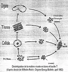 Selon Wilhelm Reich, les bions[1] seraient des « vésicules » d'« énergie » représentant des stades intermédiaires entre la substance minérale et la substance vivante. Selon cet auteur, ils se formeraient continuellement dans la nature par un processus de désintégration de la matière organique et inorganique, processus que cet auteur prétend avoir reproduit expérimentalement. Ils seraient chargés d'un concept appelé « orgone » et se transformeraient, toujours selon cet auteur, dans leur développement en protozoaires et en bactéries ou en bacilles T.
