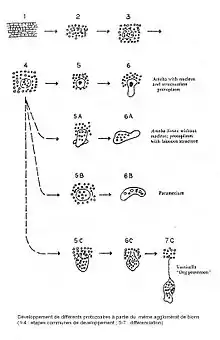 Développement de différents protozoaires à partir d'un même agglomérat membraneux de bions T.
