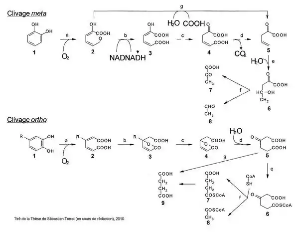 Ces voies peuvent être différenciées par le positionnement des oxygènes apportés par la dioxygénase qui vont cliver le cycle aromatique.