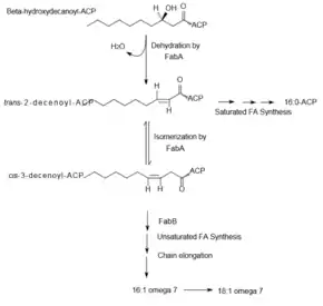 - Le trans-2-décénoyle peut également être isomérisé en cis-3-décénoyle par la protéine FabA et conduire dans ce cas à des acides gras insaturés, les deux principaux formés étant l'acide palmitoléique (cis-Δ9 16:1 n−7) et l'acide cis-vaccénique (cis-Δ11 18:1 n−7)[5].