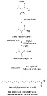 Les α-cétoacides intervenant comme amorces dérivent de la transamination et de la décarboxylation de la valine, de la leucine et de l'isoleucine pour donner respectivement de l'isobutyryl-CoA, de la 3-méthylbutyryl-CoA, et de la 2-méthylbutyryl-CoA[13]. La première amorce, issue de la valine, donne des acides gras de structure iso à nombre pair d'atomes de carbone tels que l'acide 14-méthylpentadécanoïque (isopalmitique) tandis que la deuxième, issue de la leucine, peut donner des acides gras de structure iso à nombre impair d'atomes de carbone tels que l'acide 13-méthyltétradécanoïque, et que la troisième, issue de l'isoleucine, conduit aux acides gras de structure antéiso à nombre impair d'atomes de carbone tels que l'acide 12-méthyltétradécanoïque[14].