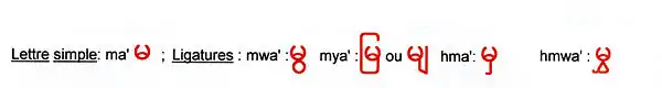 - L'existence de consonnes pouvant se lier ensemble entraîne des graphies particulières appelées ligatures pour noter par exemple les sons /mw(a)/ ou /hmw(a)/ :