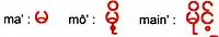 - Les signes adjoints à une lettre (au-dessus, au-dessous, à droite, à gauche) indiquent l'un des deux autres tons ainsi que les voyelles autres que le /a'/. Il y en a 20 pour les syllabes ouvertes et 32 pour les syllabes fermées (voir plus bas). Par exemple :