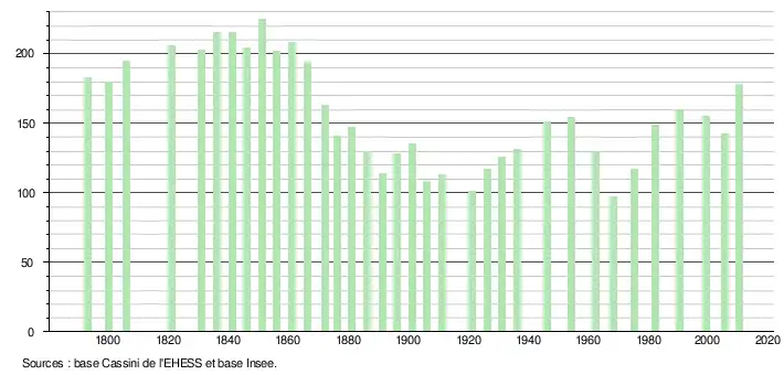 L'évolution du nombre d'habitants est connue à travers les recensements de la population effectués dans la commune depuis 1793. À partir du , les populations légales des communes sont publiées annuellement dans le cadre d'un recensement qui repose désormais sur une collecte d'information annuelle, concernant successivement tous les territoires communaux au cours d'une période de cinq ans. Pour les communes de moins de 10 000 habitants, une enquête de recensement portant sur toute la population est réalisée tous les cinq ans, les populations légales des années intermédiaires étant quant à elles estimées par interpolation ou extrapolation[4]. Pour la commune, le premier recensement exhaustif entrant dans le cadre du nouveau dispositif a été réalisé en 2005[5],[Note 1].