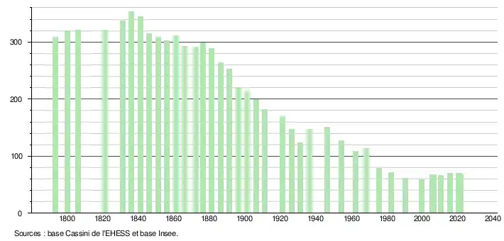 L'évolution du nombre d'habitants est connue à travers les recensements de la population effectués dans la commune depuis 1793. Pour les communes de moins de 10 000 habitants, une enquête de recensement portant sur toute la population est réalisée tous les cinq ans, les populations légales des années intermédiaires étant quant à elles estimées par interpolation ou extrapolation[17]. Pour la commune, le premier recensement exhaustif entrant dans le cadre du nouveau dispositif a été réalisé en 2005[18].