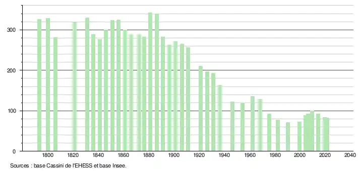 L'évolution du nombre d'habitants est connue à travers les recensements de la population effectués dans la commune depuis 1793. Pour les communes de moins de 10 000 habitants, une enquête de recensement portant sur toute la population est réalisée tous les cinq ans, les populations légales des années intermédiaires étant quant à elles estimées par interpolation ou extrapolation[14]. Pour la commune, le premier recensement exhaustif entrant dans le cadre du nouveau dispositif a été réalisé en 2004[15].