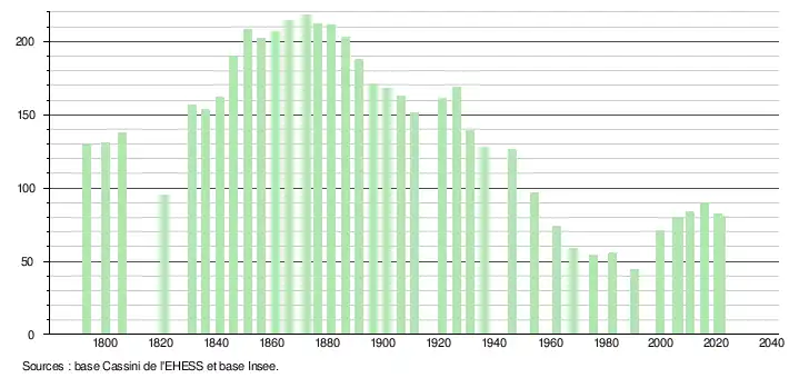 L'évolution du nombre d'habitants est connue à travers les recensements de la population effectués dans la commune depuis 1793. Pour les communes de moins de 10 000 habitants, une enquête de recensement portant sur toute la population est réalisée tous les cinq ans, les populations légales des années intermédiaires étant quant à elles estimées par interpolation ou extrapolation[14]. Pour la commune, le premier recensement exhaustif entrant dans le cadre du nouveau dispositif a été réalisé en 2005[15].