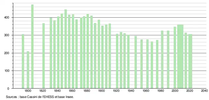 L'évolution du nombre d'habitants est connue à travers les recensements de la population effectués dans la commune depuis 1793. Pour les communes de moins de 10 000 habitants, une enquête de recensement portant sur toute la population est réalisée tous les cinq ans, les populations légales des années intermédiaires étant quant à elles estimées par interpolation ou extrapolation[26]. Pour la commune, le premier recensement exhaustif entrant dans le cadre du nouveau dispositif a été réalisé en 2004[27].