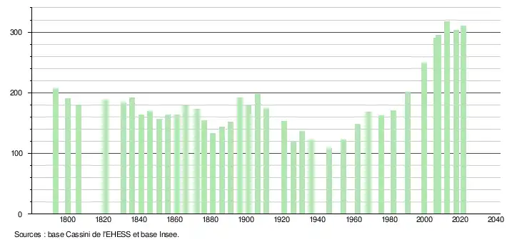 L'évolution du nombre d'habitants est connue à travers les recensements de la population effectués dans la commune depuis 1793. Pour les communes de moins de 10 000 habitants, une enquête de recensement portant sur toute la population est réalisée tous les cinq ans, les populations légales des années intermédiaires étant quant à elles estimées par interpolation ou extrapolation[27]. Pour la commune, le premier recensement exhaustif entrant dans le cadre du nouveau dispositif a été réalisé en 2007[28].