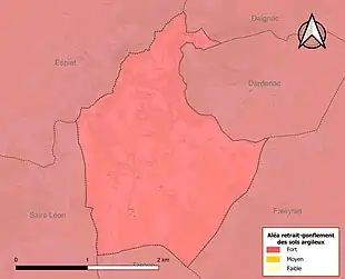 Le retrait-gonflement des sols argileux est susceptible d'engendrer des dommages importants aux bâtiments en cas d’alternance de périodes de sécheresse et de pluie. La totalité de la commune est en aléa moyen ou fort (67,4 % au niveau départemental et 48,5 % au niveau national). Sur les 118 bâtiments dénombrés sur la commune en 2019, 118 sont en aléa moyen ou fort, soit 100 %, à comparer aux 84 % au niveau départemental et 54 % au niveau national. Une cartographie de l'exposition du territoire national au retrait gonflement des sols argileux est disponible sur le site du BRGM[21],[Carte 2].