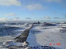 Vue de la borne géodésique en 2007, après sa restauration ; la hauteur de la base correspond à l'ancien niveau de la tourbe.