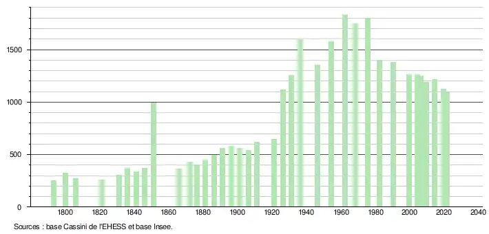 L'évolution du nombre d'habitants est connue à travers les recensements de la population effectués dans la commune depuis 1793. Pour les communes de moins de 10 000 habitants, une enquête de recensement portant sur toute la population est réalisée tous les cinq ans, les populations légales des années intermédiaires étant quant à elles estimées par interpolation ou extrapolation[19]. Pour la commune, le premier recensement exhaustif entrant dans le cadre du nouveau dispositif a été réalisé en 2004[20].