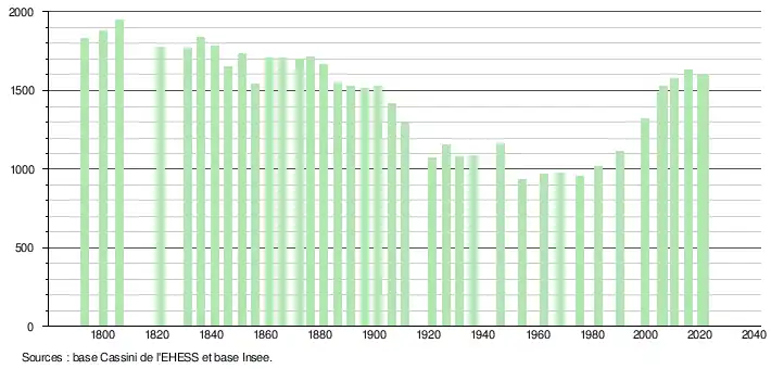 L'évolution du nombre d'habitants est connue à travers les recensements de la population effectués dans la commune depuis 1793. Pour les communes de moins de 10 000 habitants, une enquête de recensement portant sur toute la population est réalisée tous les cinq ans, les populations légales des années intermédiaires étant quant à elles estimées par interpolation ou extrapolation[35]. Pour la commune, le premier recensement exhaustif entrant dans le cadre du nouveau dispositif a été réalisé en 2005[36].