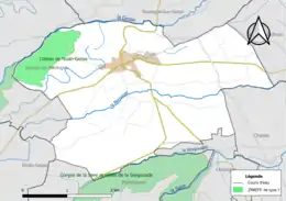 L'occupation des sols de la commune, telle qu'elle ressort de la base de données européenne d’occupation biophysique des sols Corine Land Cover (CLC), est marquée par l'importance des territoires agricoles (72,7 % en 2018), une proportion identique à celle de 1990 (72,6 %). La répartition détaillée en 2018 est la suivante : zones agricoles hétérogènes (47,1 %), forêts (24,4 %), terres arables (17,5 %), prairies (8,1 %), zones urbanisées (3 %)[22]. L'évolution de l’occupation des sols de la commune et de ses infrastructures peut être observée sur les différentes représentations cartographiques du territoire : la carte de Cassini (XVIIIe siècle), la carte d'état-major (1820-1866) et les cartes ou photos aériennes de l'IGN pour la période actuelle (1950 à aujourd'hui)[Carte 2].
