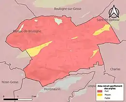 Le retrait-gonflement des sols argileux est susceptible d'engendrer des dommages importants aux bâtiments en cas d’alternance de périodes de sécheresse et de pluie. 98,9 % de la superficie communale est en aléa moyen ou fort (88,8 % au niveau départemental et 48,5 % au niveau national). Sur les 256 bâtiments dénombrés sur la commune en 2019, 255 sont en aléa moyen ou fort, soit 100 %, à comparer aux 98 % au niveau départemental et 54 % au niveau national. Une cartographie de l'exposition du territoire national au retrait gonflement des sols argileux est disponible sur le site du BRGM[26],[Carte 3].