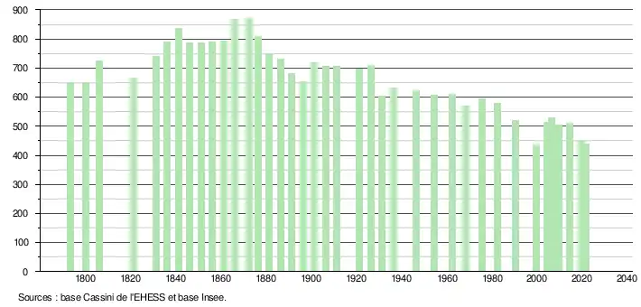 | L'évolution du nombre d'habitants est connue à travers les recensements de la population effectués dans la commune depuis 1793. Pour les communes de moins de 10 000 habitants, une enquête de recensement portant sur toute la population est réalisée tous les cinq ans, les populations légales des années intermédiaires étant quant à elles estimées par interpolation ou extrapolation[28]. Pour la commune, le premier recensement exhaustif entrant dans le cadre du nouveau dispositif a été réalisé en 2004[29]. En 2021, la commune comptait 439 habitants[Note 4], en diminution de 15,74 % par rapport à 2015 (Haute-Garonne : +7,43 %, France hors Mayotte : +1,84 %). |