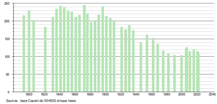 L'évolution du nombre d'habitants est connue à travers les recensements de la population effectués dans la commune depuis 1793. Pour les communes de moins de 10 000 habitants, une enquête de recensement portant sur toute la population est réalisée tous les cinq ans, les populations légales des années intermédiaires étant quant à elles estimées par interpolation ou extrapolation[43]. Pour la commune, le premier recensement exhaustif entrant dans le cadre du nouveau dispositif a été réalisé en 2005[44].