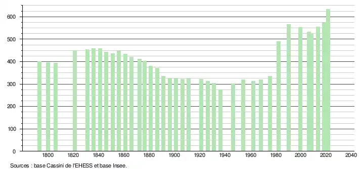 L'évolution du nombre d'habitants est connue à travers les recensements de la population effectués dans la commune depuis 1793. Pour les communes de moins de 10 000 habitants, une enquête de recensement portant sur toute la population est réalisée tous les cinq ans, les populations légales des années intermédiaires étant quant à elles estimées par interpolation ou extrapolation[23]. Pour la commune, le premier recensement exhaustif entrant dans le cadre du nouveau dispositif a été réalisé en 2008[24].