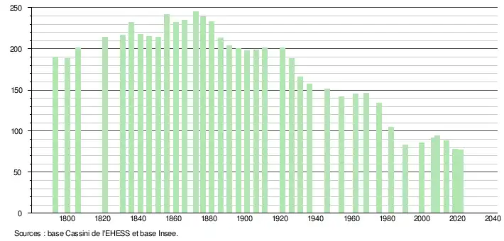L'évolution du nombre d'habitants est connue à travers les recensements de la population effectués dans la commune depuis 1793. Pour les communes de moins de 10 000 habitants, une enquête de recensement portant sur toute la population est réalisée tous les cinq ans, les populations légales des années intermédiaires étant quant à elles estimées par interpolation ou extrapolation[18]. Pour la commune, le premier recensement exhaustif entrant dans le cadre du nouveau dispositif a été réalisé en 2008[19].