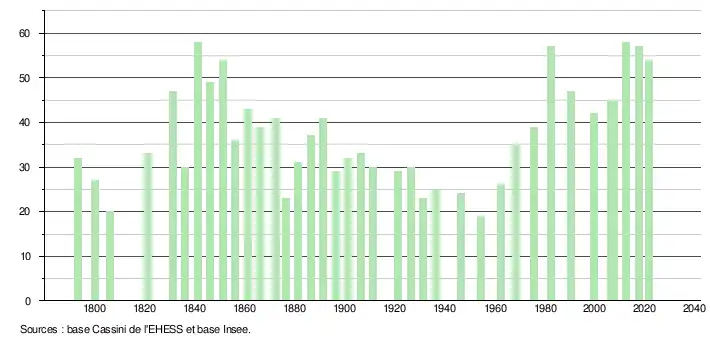 L'évolution du nombre d'habitants est connue à travers les recensements de la population effectués dans la commune depuis 1793. Pour les communes de moins de 10 000 habitants, une enquête de recensement portant sur toute la population est réalisée tous les cinq ans, les populations légales des années intermédiaires étant quant à elles estimées par interpolation ou extrapolation[16]. Pour la commune, le premier recensement exhaustif entrant dans le cadre du nouveau dispositif a été réalisé en 2007[17].