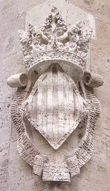 Pierre IV d'Aragon, en signe de reconnaissance à la résistance de Valence contre Pierre Ier le Cruel de Castille lors de la Guerre des deux Pierres (1356-1365), concède à la ville de Valence le droit d'utiliser ses armes et la couronne royale. De plus, on ajouta deux "L", un à chaque côté de l'écu, symbolisant la loyauté de la ville pendant les deux sièges qu'elle subit durant de la guerre contre la Castille.