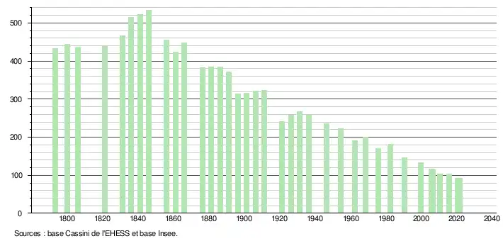 L'évolution du nombre d'habitants est connue à travers les recensements de la population effectués dans la commune depuis 1793. Pour les communes de moins de 10 000 habitants, une enquête de recensement portant sur toute la population est réalisée tous les cinq ans, les populations légales des années intermédiaires étant quant à elles estimées par interpolation ou extrapolation[18]. Pour la commune, le premier recensement exhaustif entrant dans le cadre du nouveau dispositif a été réalisé en 2005[19].