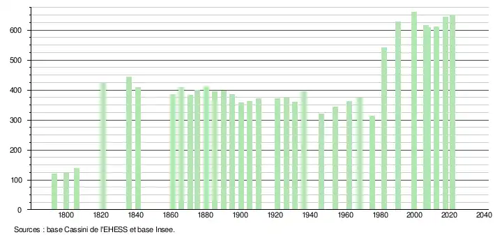 L'évolution du nombre d'habitants est connue à travers les recensements de la population effectués dans la commune depuis 1793. Pour les communes de moins de 10 000 habitants, une enquête de recensement portant sur toute la population est réalisée tous les cinq ans, les populations légales des années intermédiaires étant quant à elles estimées par interpolation ou extrapolation[19]. Pour la commune, le premier recensement exhaustif entrant dans le cadre du nouveau dispositif a été réalisé en 2007[20].