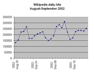 Le projet accueille de nombreux nouveaux participants après avoir été mentionné trois fois sur le site Slashdot, avec deux mentions mineures en [24],[25]. Il a ensuite bénéficié d'une couverture importante par le site communautaire, technologique et culturel Kuro5hin, le [26]. Entre ces quelques rapides pics, son audience progressa régulièrement grâce à d'autres sources, notamment Google, qui envoyait, à lui seul, plusieurs centaines de nouveaux visiteurs vers le site de Wikipédia.