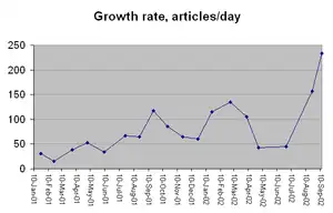 Le projet dépasse les 1 000 articles le , et les 10 000 articles autour du . Dans sa première année d'existence, plus de 20 000 entrées encyclopédiques furent créées, soit un taux de plus de 1 500 articles par mois. Le , le projet atteint les 40 000 articles. Le taux de croissance a plus ou moins régulièrement augmenté depuis la création de Wikipédia, excepté durant des coupures liées à des problèmes logiciels ou matériels.