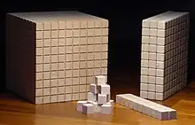 Il s'agit de manipuler des petits cubes, des réglettes de taille 10 cubes, des plaques de taille 10 cubes, des gros cubes cubes de taille 10 petits cubes etc. pour représenter des entiers dans une numération décimale.