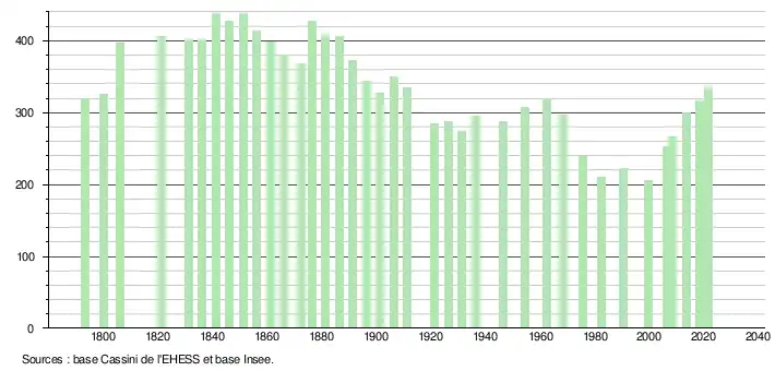 L'évolution du nombre d'habitants est connue à travers les recensements de la population effectués dans la commune depuis 1793. Pour les communes de moins de 10 000 habitants, une enquête de recensement portant sur toute la population est réalisée tous les cinq ans, les populations légales des années intermédiaires étant quant à elles estimées par interpolation ou extrapolation[29]. Pour la commune, le premier recensement exhaustif entrant dans le cadre du nouveau dispositif a été réalisé en 2008[30].