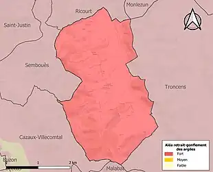 Le retrait-gonflement des sols argileux est susceptible d'engendrer des dommages importants aux bâtiments en cas d’alternance de périodes de sécheresse et de pluie. La totalité de la commune est en aléa moyen ou fort (94,5 % au niveau départemental et 48,5 % au niveau national). Sur les 35 bâtiments dénombrés sur la commune en 2019, 35 sont en aléa moyen ou fort, soit 100 %, à comparer aux 93 % au niveau départemental et 54 % au niveau national. Une cartographie de l'exposition du territoire national au retrait gonflement des sols argileux est disponible sur le site du BRGM[20],[Carte 3].