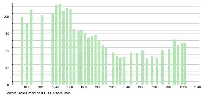 L'évolution du nombre d'habitants est connue à travers les recensements de la population effectués dans la commune depuis 1793. Pour les communes de moins de 10 000 habitants, une enquête de recensement portant sur toute la population est réalisée tous les cinq ans, les populations légales des années intermédiaires étant quant à elles estimées par interpolation ou extrapolation[19]. Pour la commune, le premier recensement exhaustif entrant dans le cadre du nouveau dispositif a été réalisé en 2007[20].