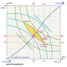La boite d'Edgeworth, associée aux courbes d’indifférence (ou d'iso-utilité), permet une représentation géométrique simple de la notion d'équilibre pour une économie composée de deux agents, A et B, et de deux types de biens, 1 et 2. Selon ce modèle chaque agent est capable de classifier l'espace des biens (commodités) par une famille de courbe de même utilité (courbes d'indifférence). Par hypothèse, ces courbes sont convexes et plus elles sont éloignées de l'origine plus la préférence est grande pour l'agent. Dans ce modèle les optima de Pareto sont représentés par la courbe des contrats, les points de l'espace des biens où les courbes d'indifférence de l'agent A sont tangentes à celles de l'agent B. Étant donné une situation initiale autre qu'un optimum de Pareto il existe toute une zone d'échange favorable, i.e. qui augmente la préférence des deux agents et dans cette zone une famille d'optima de Pareto, points où il n'est pas possible d'augmenter la préférence d'un agent sans diminuer celle de l'autre.