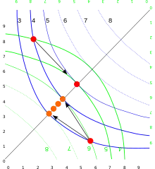 On peut représenter les préférences d'un individu en utilisant les courbes d'indifférence. En prenant l'origine en bas et à gauche on a tracé en bleu plusieurs courbes d'indifférence correspondant à différents niveaux d'utilité. L'individu 1 possède 2 unités du premier bien (en abscisse) et 8 unités du deuxième bien (en ordonnée). Le point rouge en haut et à gauche correspond au stock de biens du premier individu.