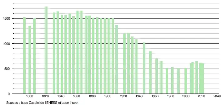 L'évolution du nombre d'habitants est connue à travers les recensements de la population effectués dans la commune depuis 1793. Pour les communes de moins de 10 000 habitants, une enquête de recensement portant sur toute la population est réalisée tous les cinq ans, les populations légales des années intermédiaires étant quant à elles estimées par interpolation ou extrapolation[22]. Pour la commune, le premier recensement exhaustif entrant dans le cadre du nouveau dispositif a été réalisé en 2008[23].