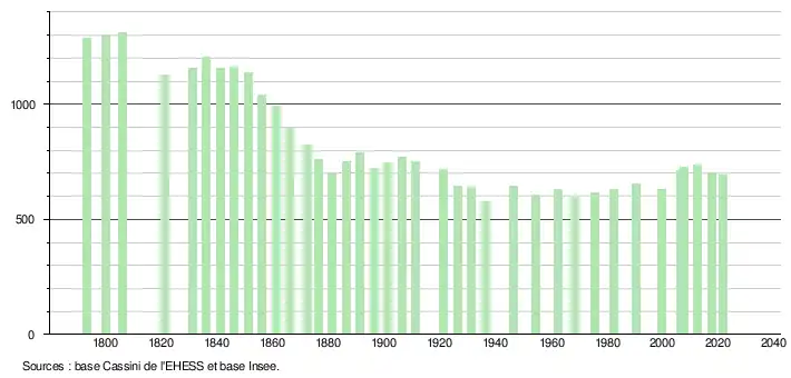 L'évolution du nombre d'habitants est connue à travers les recensements de la population effectués dans la commune depuis 1793. Pour les communes de moins de 10 000 habitants, une enquête de recensement portant sur toute la population est réalisée tous les cinq ans, les populations légales des années intermédiaires étant quant à elles estimées par interpolation ou extrapolation[22]. Pour la commune, le premier recensement exhaustif entrant dans le cadre du nouveau dispositif a été réalisé en 2007[23].