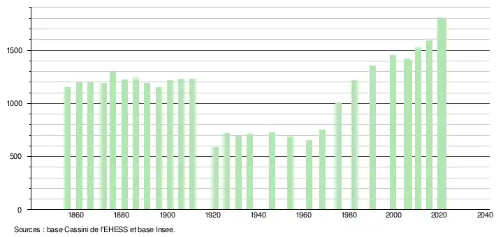 L'évolution du nombre d'habitants est connue à travers les recensements de la population effectués dans la commune depuis 1856. Pour les communes de moins de 10 000 habitants, une enquête de recensement portant sur toute la population est réalisée tous les cinq ans, les populations légales des années intermédiaires étant quant à elles estimées par interpolation ou extrapolation[24]. Pour la commune, le premier recensement exhaustif entrant dans le cadre du nouveau dispositif a été réalisé en 2005[25].