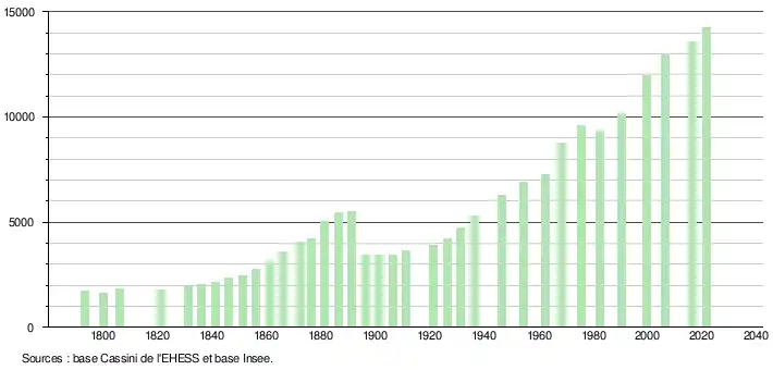 L'évolution du nombre d'habitants est connue à travers les recensements de la population effectués dans la commune depuis 1793. Pour les communes de plus de 10 000 habitants les recensements ont lieu chaque année à la suite d'une enquête par sondage auprès d'un échantillon d'adresses représentant 8 % de leurs logements, contrairement aux autres communes qui ont un recensement réel tous les cinq ans[32],[Note 3].